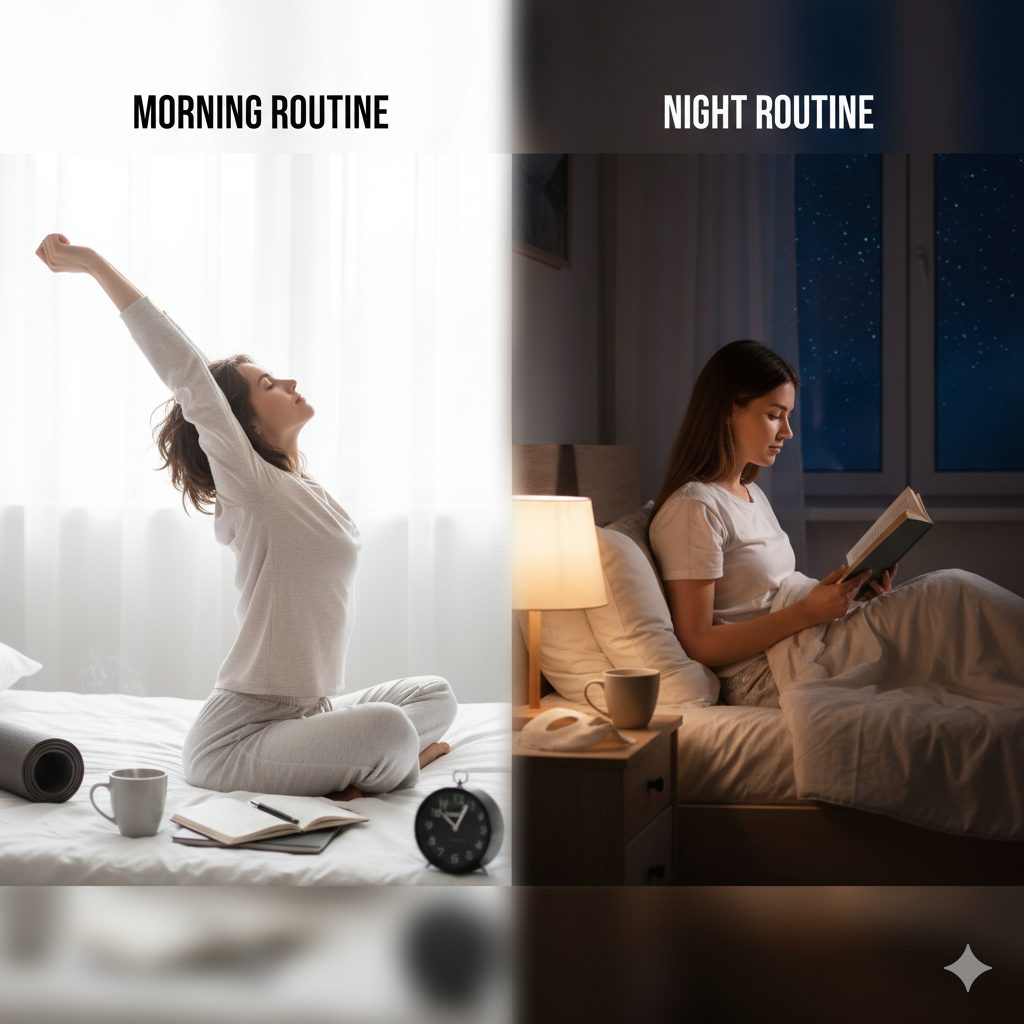 一方、ナイトルーティンは寝る前の習慣ですね。お風呂に入る、体をほぐす、好きな本を読むなど、リラックスできる時間を作ることで、一日の疲れを癒せます。こうした習慣があると、体が「そろそろ眠る時間だ」と覚えてくれて、自然と眠りにつきやすくなるんです。