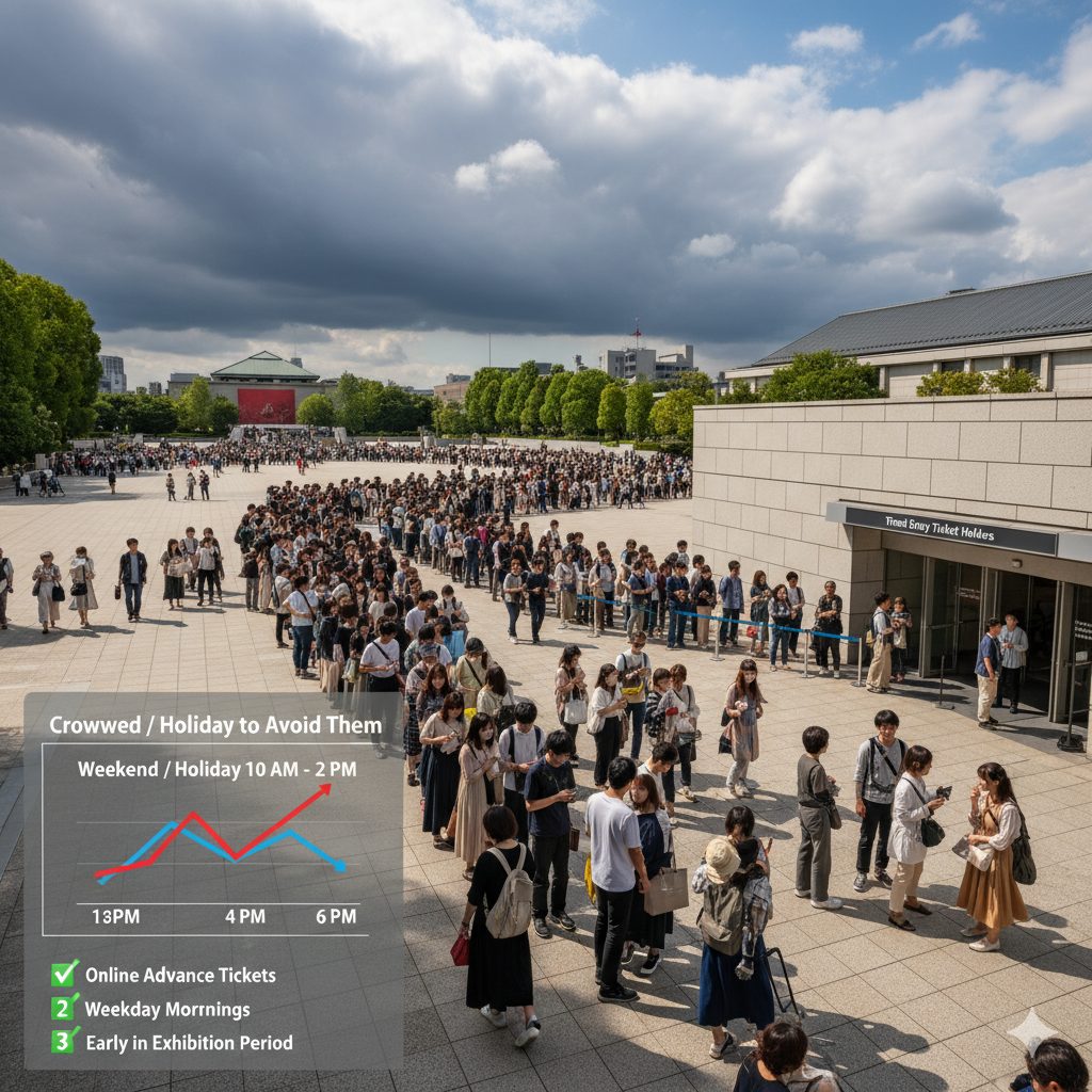 まず狙いたいのが 開館直後 です。東京都美術館は9時30分に開館しますが、この時間帯に訪れると比較的空いており、ゆっくりと作品を楽しむことができます。反対に午後は人の波が増え、特に14時〜16時頃は最も混雑する時間帯となります。