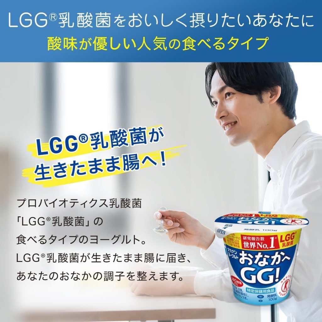 ヨーグルト おなかへGG!は研究報告数世界No.1のLGG®乳酸菌が摂取できるヨーグルトです。酸味が優しくとろりとした食感は、まるでデザート感覚なのですっぱいのが苦手なお子様でも「嫌がることなく喜んで 食べてくれる!」と好評です。特定保健用食品でLGG®乳酸菌が生きたまま腸に届き、おなかの中の良い菌を増やし悪い菌を減らして、腸内の環境を良好にするよう工夫したお腹の調子を整える食品です。100g(1個あたり)にLGG®乳酸菌140億個以上含まれています。