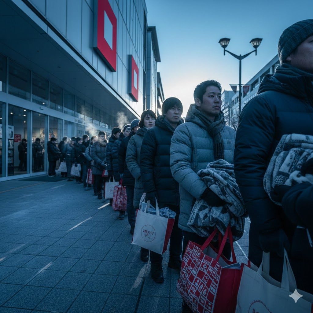 結論から言うと、都心部の大型店舗なら開店1時間前、郊外店なら30分前を目安にすることをおすすめします。私の経験上、これより遅いと人気サイズはほぼ売り切れてました。都心の旗艦店だと元日や1月2日に朝8時開店する店舗もあって、そういう店は朝7時には行列ができ始めるんです。驚きました!