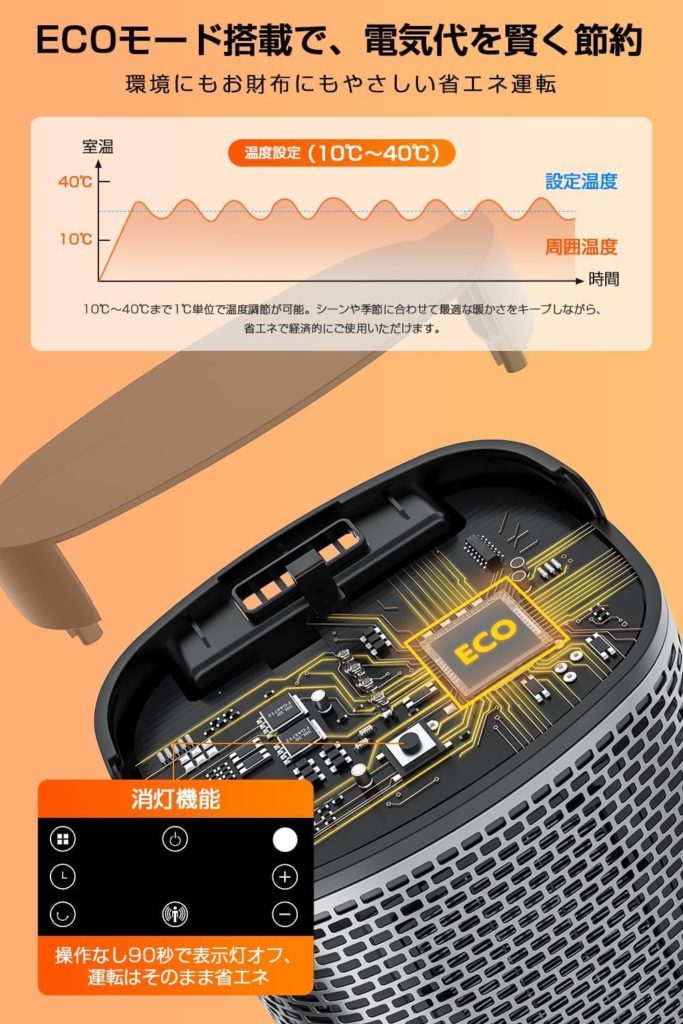 短時間で急速に暖まるため、ダラダラと長時間つけっぱなしにする必要がなく、結果的に電気代を節約しやすいのです。また、サーモスタット機能により、一定の温度に達すると自動で運転を調整。これにより、暖めすぎや電気の無駄遣いを防いでくれる仕組みになっています。