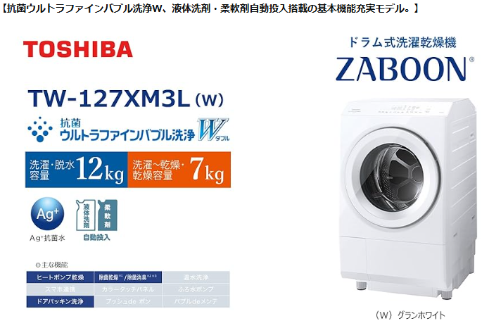 東芝のZABOONシリーズは、そのパワフルな洗浄力とユニークな技術で長年支持されてきました。TW-127XP4は、その中でも最上位に位置づけられるモデルです。大容量(洗濯12kg/乾燥7kg)を誇り、共働きや大家族にとって救世主となるスペックを持っています。