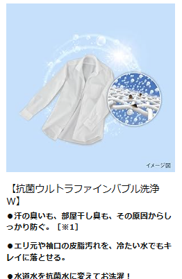 抗菌効果のある洗剤で繊維の奥まで汚れを落とし臭いを防ぎます。乾燥機能も付いており衣類を清潔に保つことができます。液体洗剤や柔軟剤の自動投入機能もあり使いやすいデザインです。