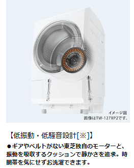 TW-127XP4に搭載されている「S-DDモーター」は、強力でありながら、運転音を抑える設計になっています。低振動なので、深夜や早朝に洗濯したい共働き世帯や、赤ちゃんがいるご家庭でも、音を気にせず安心して利用できる点が、このドラム式洗濯乾燥機の大きな魅力です。