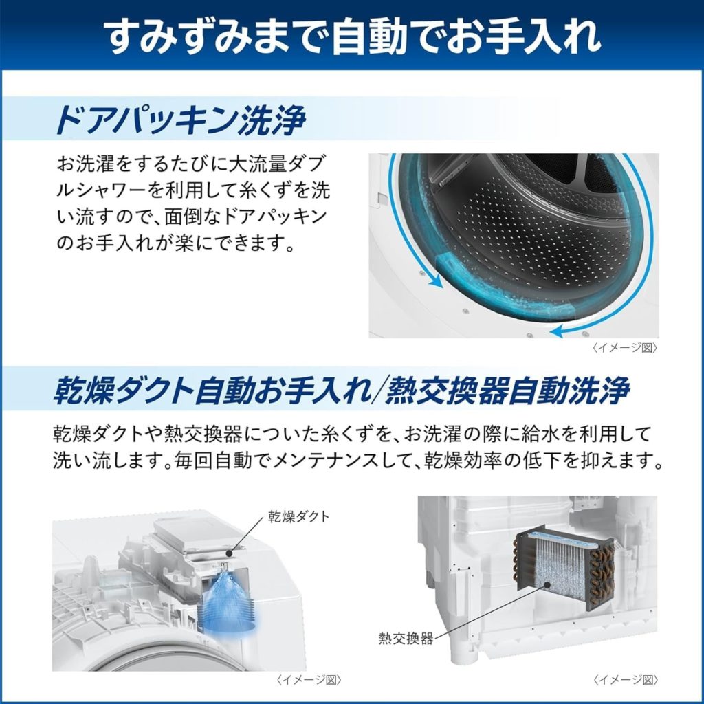 TW-127XP4は、乾燥のたびにホコリを自動で取り除く「乾燥ダクト自動お掃除」機能を搭載。また、洗濯槽の裏側も自動で洗い流す機能があり、カビの発生を抑え、清潔な状態を保ちやすい設計になっています。