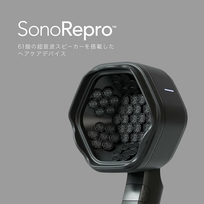 ピクシーダストテクノロジーズとアンファーが共同開発した家庭用ヘアケア・スカルプケアデバイス。SonoReproは、特許取得の超音波制御技術を使用して、「非接触振動圧刺激」を頭皮に与えます。61個の超音波スピーカーが集束した超音波による約4万回/秒の振動圧刺激で、触れずに効果的なケアが可能です。