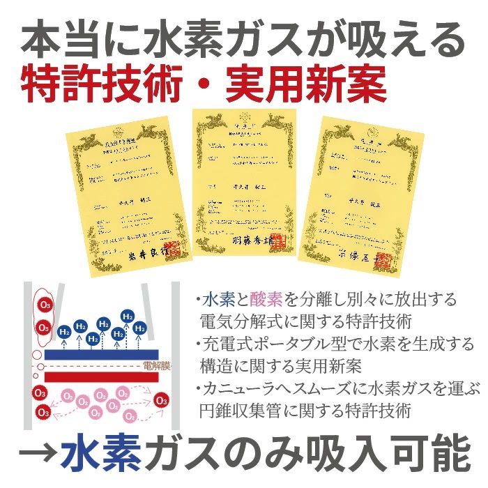 - 独自の電気分解方式で水素水としても水素吸入としても利用できます。