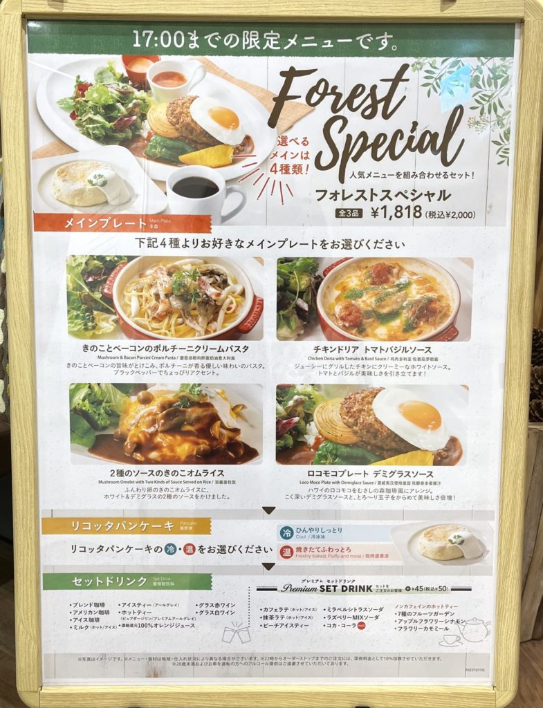 むさしの森珈琲には「ランチセット」のような明確な区切りはなく、10:30〜17:00に注文できるフォレストスペシャルなどの「ランチ時間帯限定メニュー」がある形です。