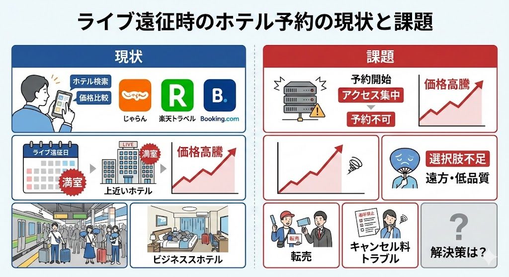 大規模なコンサートやフェスが開催されるとき、周辺のホテルは一斉に予約が埋まります。これは、あなたと同じように快適な滞在を求める数万人が、同じタイミングで同じエリアの宿泊施設を狙っているからです。