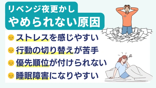 • 焦燥感タイプ:明日やらなければならないタスクが片付かず、布団に入るのが不安で、夜中に無理やり作業を続けている。