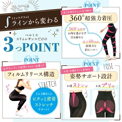 また、他の製品が単に圧力をかけるだけなのに対し、ベルミスはハイウエスト設計でお腹周りまでカバーし、骨盤周りにも適度なサポートを入れることで、全身のシルエットを整えることを目指しています。