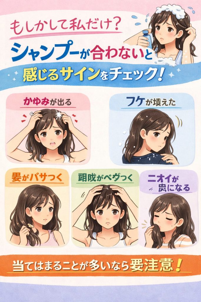 特に頭皮のかゆみやベタつき、髪のパサつきが慢性的に続く場合はサインかもしれません。