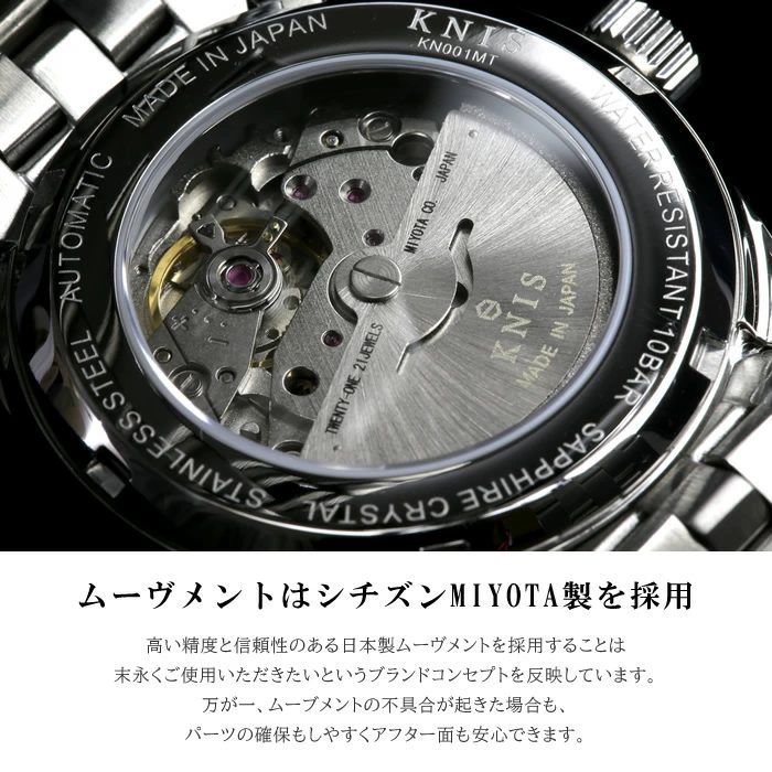 KNISの腕時計は、その心臓部に世界的に信頼性の高いセイコー製自動巻きムーブメント(NH35/NH38など)を採用しています。