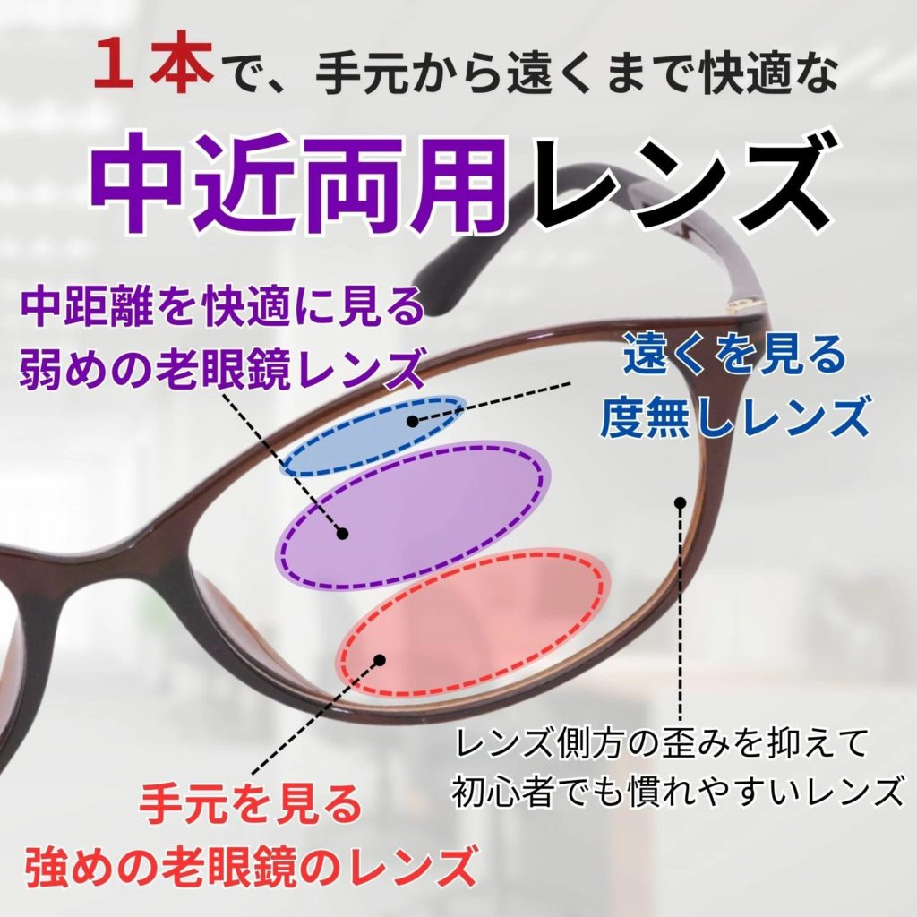 また、遠近両用よりも手元や中間の視野が広く、歪みが少ない点が最大の特徴です。