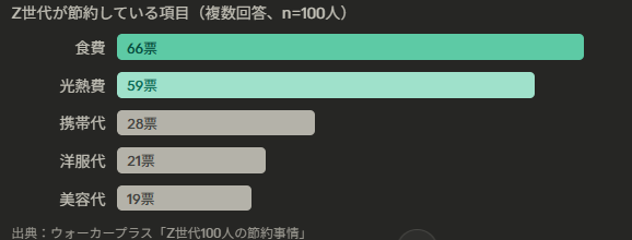 • Z世代の節約では食費(66票)が最多で、光熱費(59票)、携帯代(28票)と続く。一方で推し活や美容関連は節約の対象から外れている。