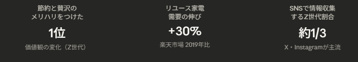 • Z世代は節約や貯蓄を重視しながらも、趣味・娯楽・ご褒美など自らの満足感も重視する傾向が続いており、コスパを求めつつ高品質な商品への関心も強い。