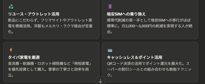 交際費やサブスク代の削減よりも、まず食と光熱費から手をつける姿勢は、単身で生活している分、自由に調整しやすいという事情が反映されている。