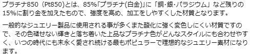 プラチナ850は、プラチナ純度85%、その他金属15%で構成される合金です。純プラチナ(Pt1000)と比較して適度な硬度があり、ジュエリーとしての実用性に優れています。プラチナ850の最大の魅力は、美しい白銀色の輝きが経年変化せず、いつまでも新品同様の美しさを保てることです。