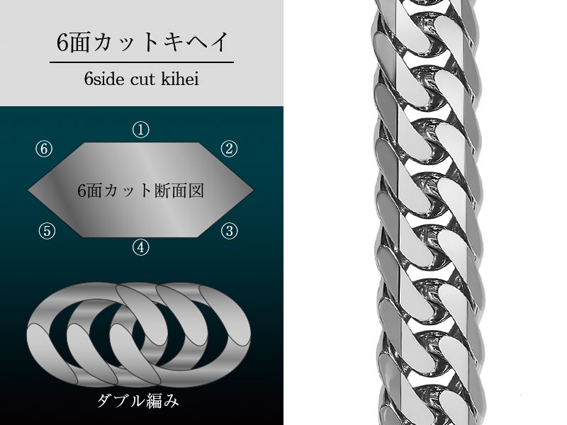 従来の喜平チェーンは2面や4面が主流でしたが、近年は6面ダブルのような複雑な構造の製品が人気を集めています。この6面ダブル構造では、各パーツに6つの面が精密にカットされ、さらに二重構造になっているため、光の反射が複雑で美しい輝きを生み出します。プラチナ850の素材と組み合わせることで、従来の喜平ネックレスとは一線を画す高級感を実現しています。