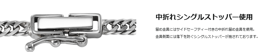 中折れ金具は、高級ジュエリーに採用される最も安全で使いやすい留め具の一つです。スペランツァのプラチナ850喜平ネックレスに使用される中折れ金具は、精密な機械加工によって作られており、確実な嵌合と簡単な操作性を両立しています。