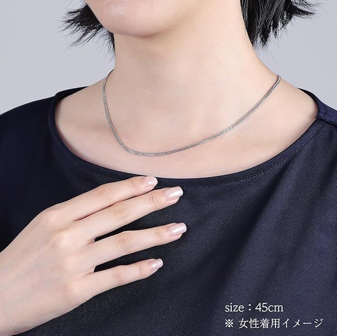 40cmは最も短いサイズで、首に沿うように着用するチョーカータイプです。華奢な印象を与え、フォーマルなシーンや上品な装いに適しています。45cmは日本人の平均的な首周りに最もフィットしやすく、最も人気の高いサイズです。50cmは胸元で美しく見える長さで、Vネックやオープンカラーのシャツとの相性が抜群です。60cmはロングタイプで、カジュアルな装いや重ね着けスタイルに適しています。