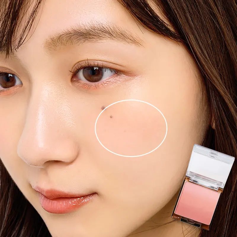 おすすめなのは、ズバリ頬の一番高い位置(ニコッと笑った時にポコッと高くなる場所)から、こめかみに向かって斜め上に入れること!こうすることで、顔がキュッと引き締まって見えて、自然な血色感と同時にリフトアップ効果も狙えちゃうんだよ。