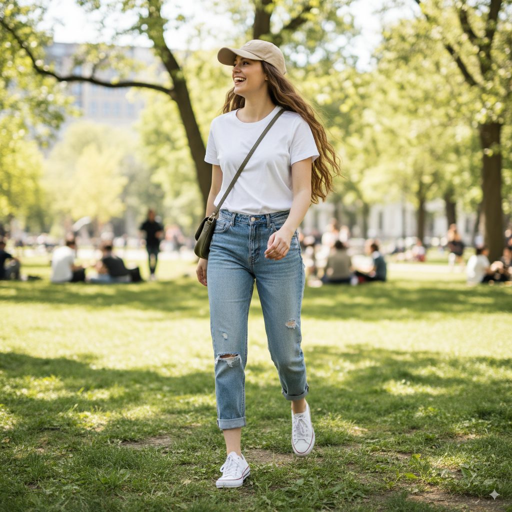 - 白Tシャツにデニムを合わせ、スニーカーとキャップでとことんカジュアルに。元気いっぱいの休日スタイルに。