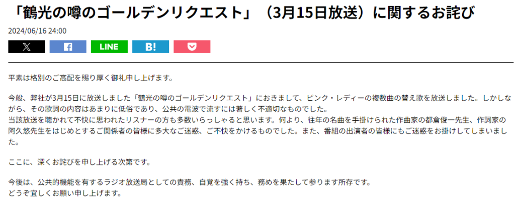 ニッポン放送は謝罪文の中で、「歌詞の内容はあまりに低俗であり、公共の電波で流すには著しく不適切なものでした」と釈明しています。