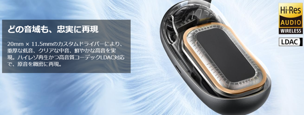 ハイレゾ音源に対応したドライバーが搭載されており、低音から高音までバランスの取れたクリアな音質を楽しむことが可能です。