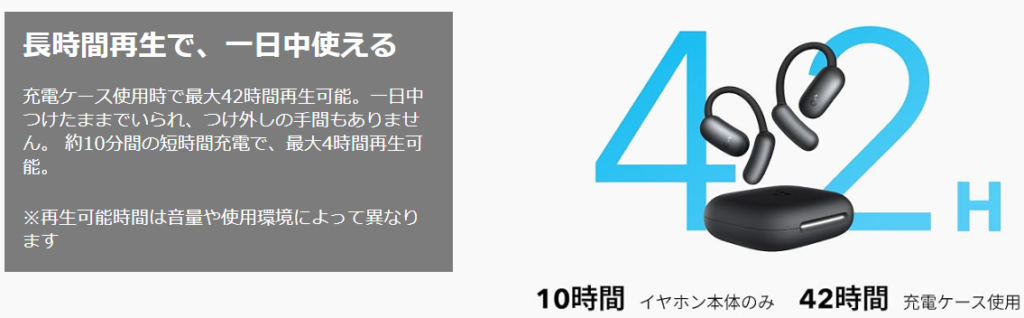 Soundcore AeroFit 2は、一度の充電で丸一日使用可能な長寿命バッテリーを誇ります。