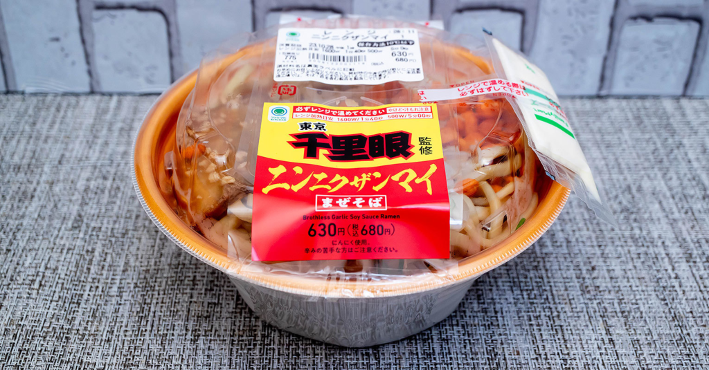 ファミリーマートで販売されているレンジ麺「千里眼監修 ニンニクザンマイ(まぜそば)」は、東京・駒場にある二郎インスパイア系ラーメンの老舗、「千里眼」が監修した商品です。
