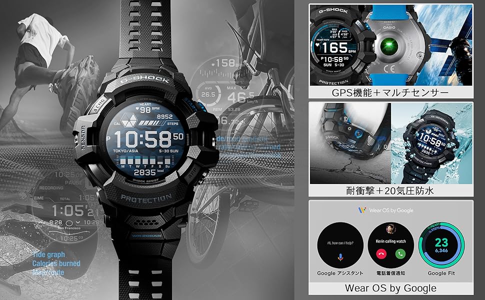 CASIO GSW-H1000は、G-SHOCK初のWear OS搭載モデルです。耐久性と最新機能を兼ね備えた本格アウトドアウォッチです。心拍計測や方位、高度/気圧、加速度、ジャイロセンサーを搭載し、GPSとの連携で活動データを正確に計測できます。20気圧防水と耐衝撃構造、防水仕様のマイクや充電端子も備えているため、アウトドアでの使用に適しています。タフネス性能と高度な機能性を兼ね備えたスマートウォッチといえます。