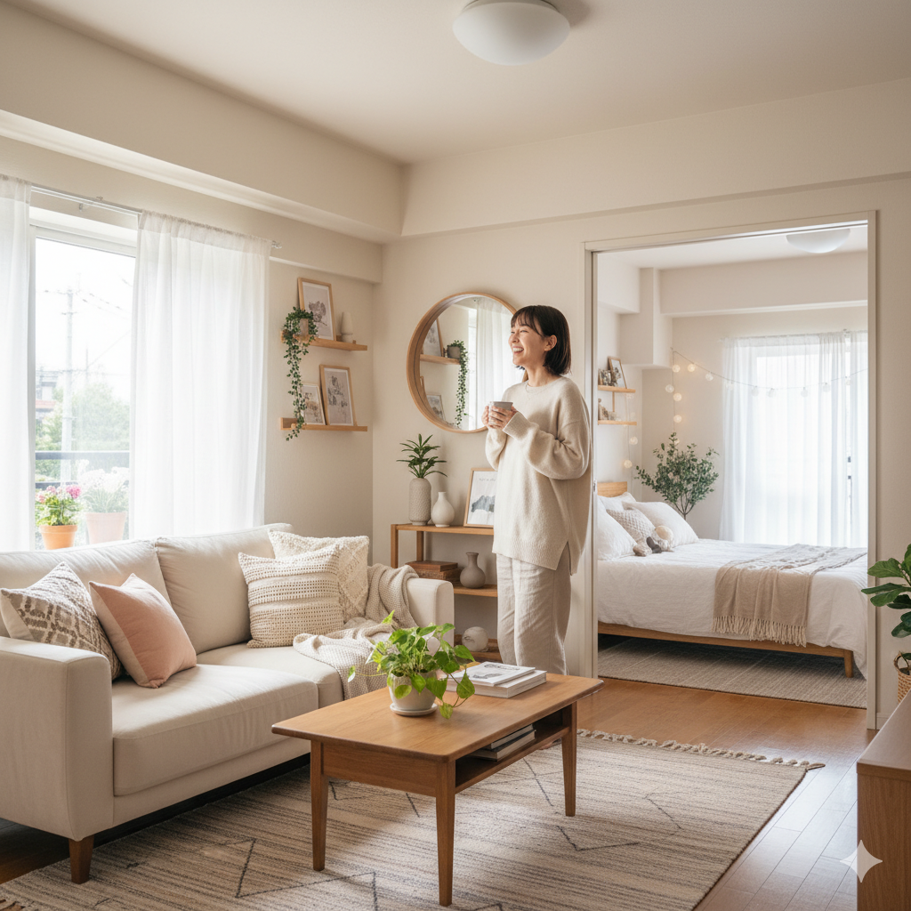 そして忘れてはいけないのが、ゆとりのある配置です。家具を詰め込みすぎず、歩きやすさを意識した配置を心がけると、毎日の暮らしがもっと快適に。間接照明やグリーン、お気に入りの雑貨を少しずつ足していけば、きっと理想のお部屋が完成します。