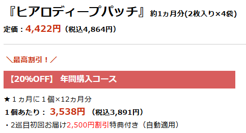 ヒアロディープパッチの定価は4,864円(税込)ですが、年間購入コースなら20%オフの3,891円(税込)で購入できます。