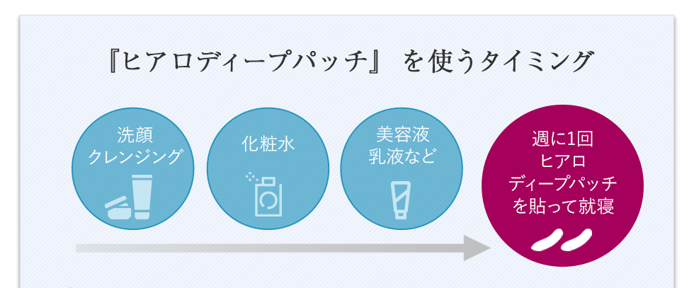 - 化粧水や乳液でしっかりと保湿した後、ヒアロディープパッチを貼ります。美容成分がより効果的に浸透。