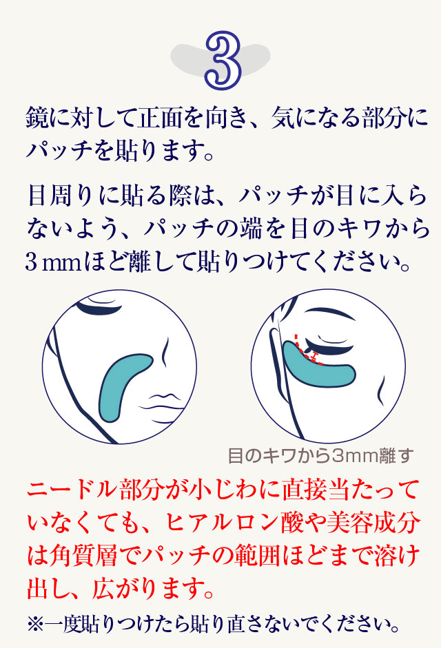 - 特に乾燥が気になる目元や口元に貼ることで、効果を最大限に引き出します。