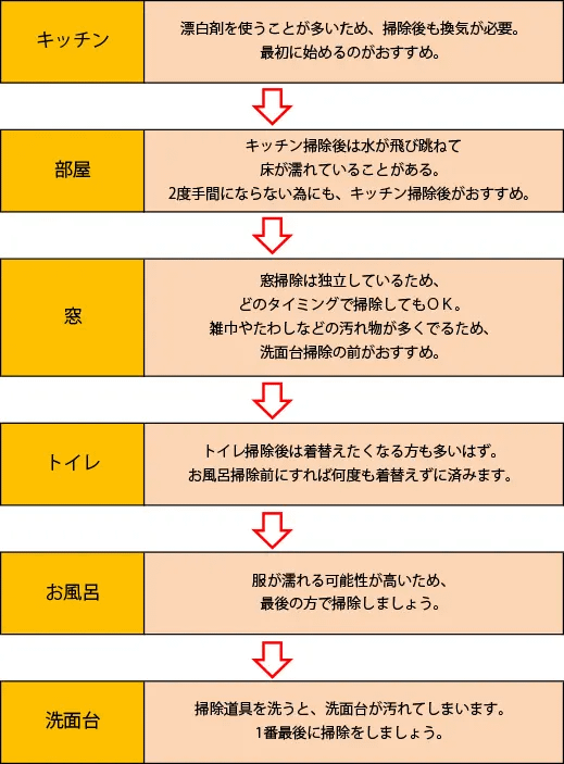 - 掃除の順序: 高い場所から低い場所へ、そして水回りを最後に掃除することで、効率よく進める。