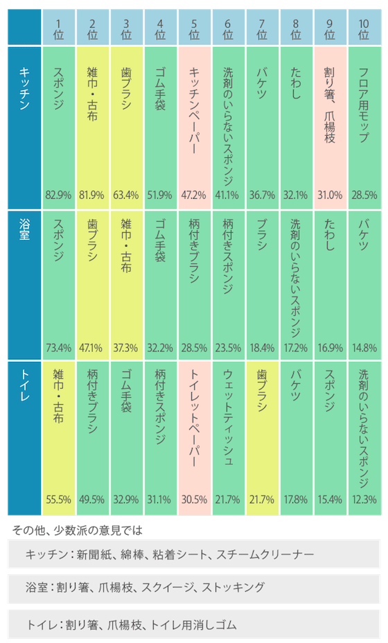 ライオンが「大掃除で使用した道具」について調べたところ、キッチン、浴室、トイレといずれの場所でも、汚れをこすったり、ふき取ったりする道具が上位を占めています。