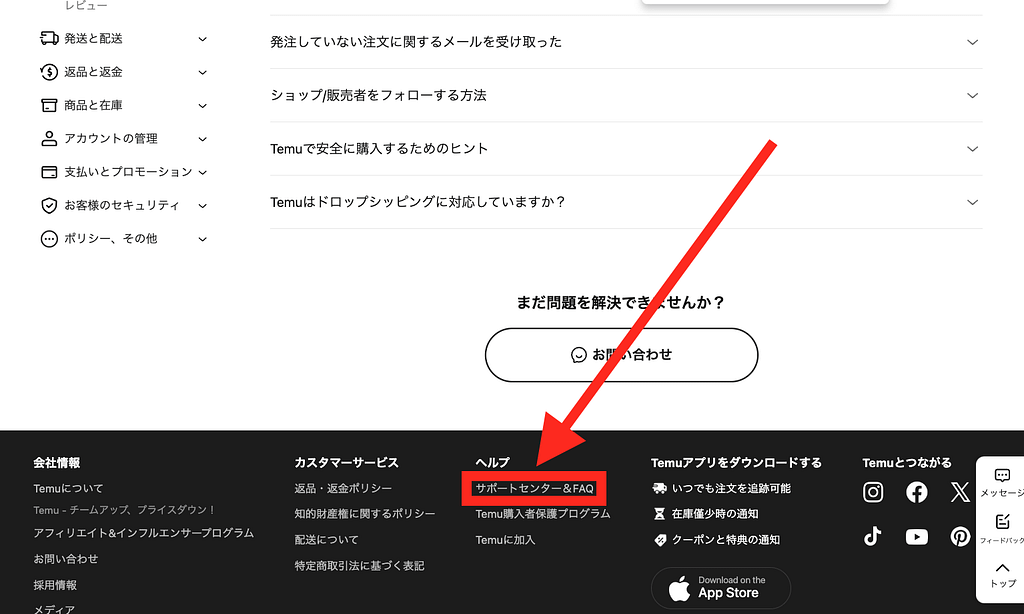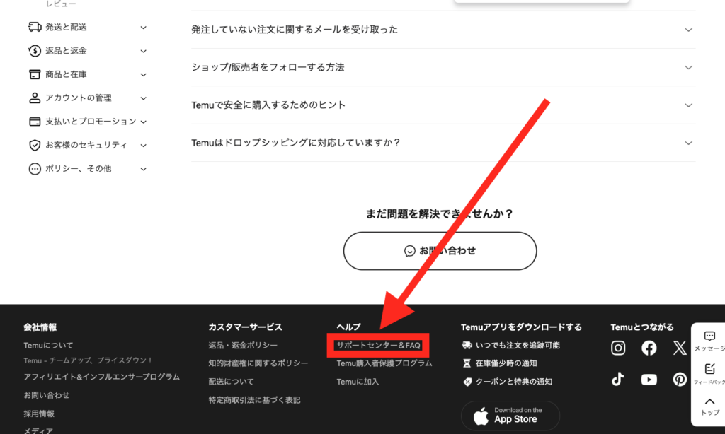 テム公式サイトを1番下までスクロールして「サポートセンター&FAQ」をクリックする。