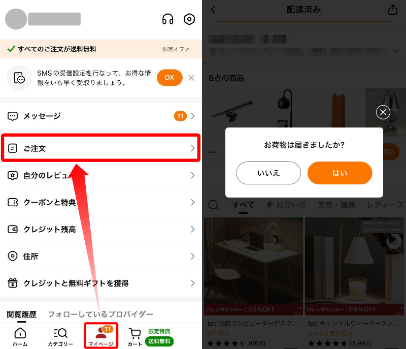 手続きの前に商品の到着を確定する必要があります。商品受け取り後、右のような表示が出たら「はい」を選択しましょう。