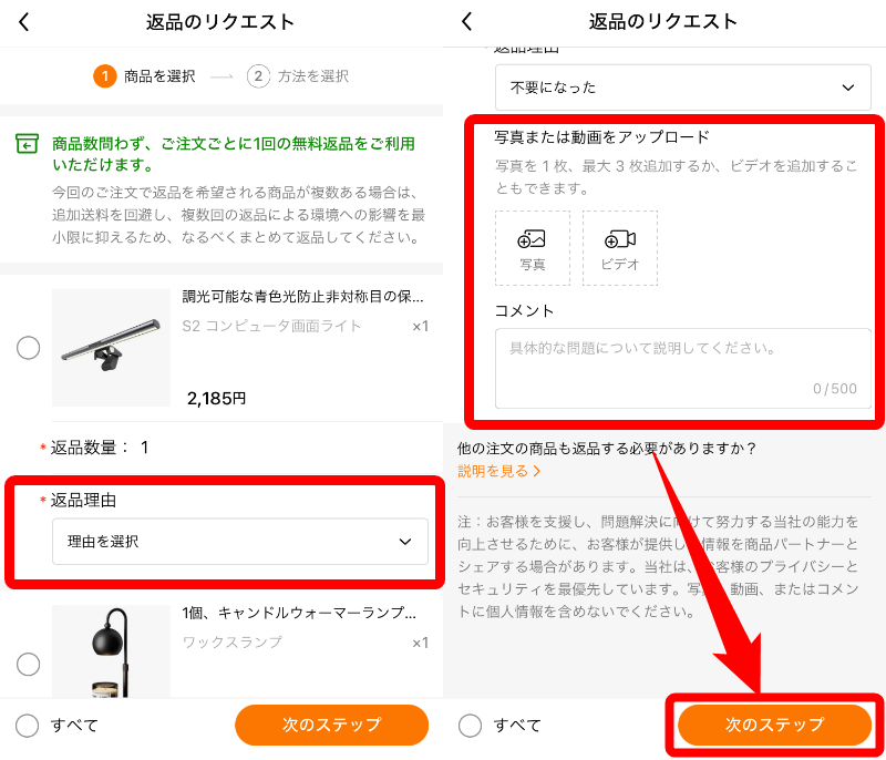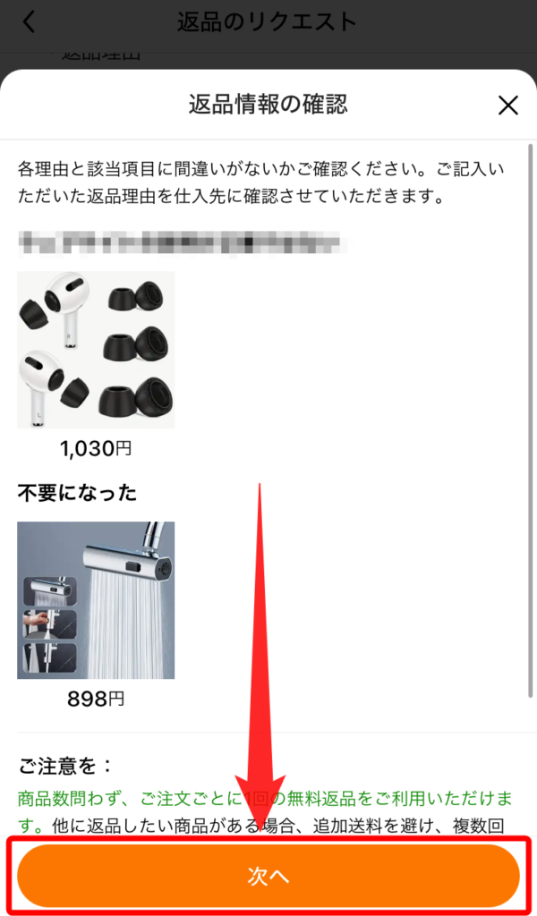 STEP4:商品情報と理由を確認して[次へ]を選択