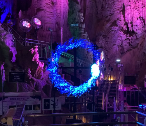 洞内最後の見どころである「月の世界」では、調光システムにより暗闇から朝日、夕日へと移り変わる光の演出が施され、幻想的な雰囲気を醸し出しています。