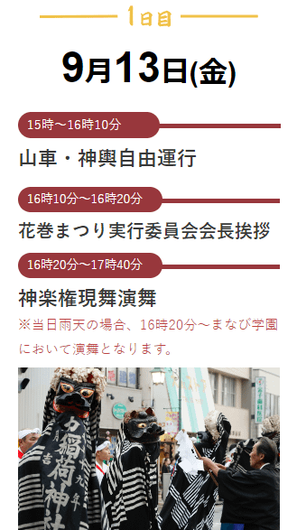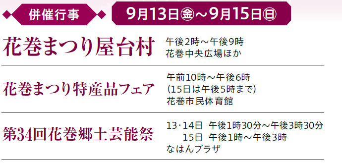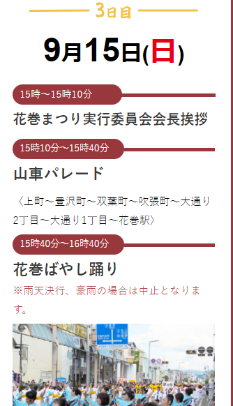 - 15:10~16:50 山車パレード(上町〜豊沢町〜双葉町〜吹張町〜大通2丁目〜大通1丁目〜花巻駅)