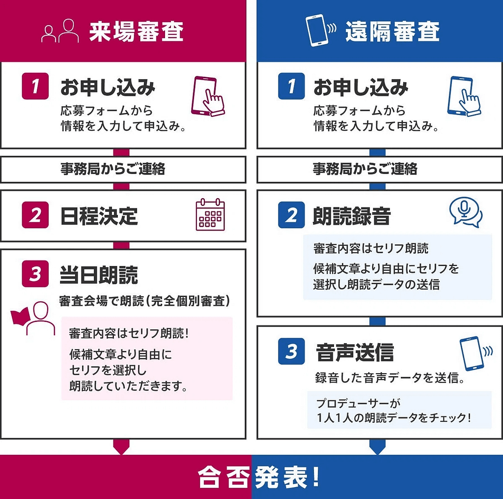 合格率は公開されていませんが、毎月数千人が参加しています。審査に合格すると、声優活動のサポートを受けられます。