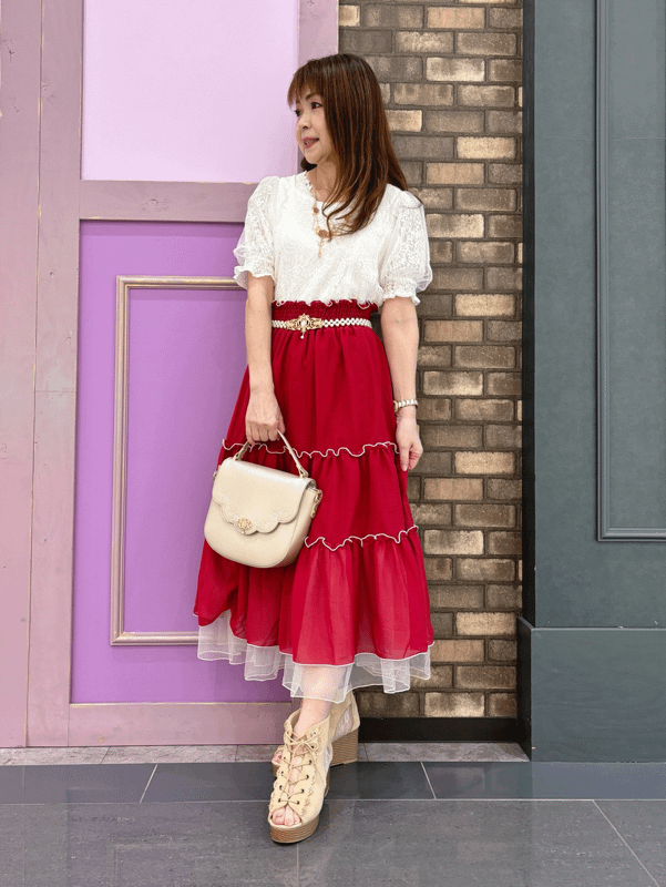 推しの赤☆☆☆軽やかなティアードスカートです♪色鮮やかでとてもキュート♡裾のフリルもポイントです◎