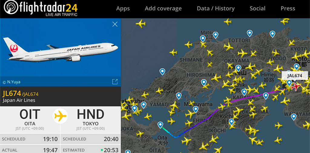 Flightradar24というサービスは世界中の数千機の飛行機をリアルタイムで追跡できて、4000以上の空港や1200以上の航空会社のフライトをカバーしています。