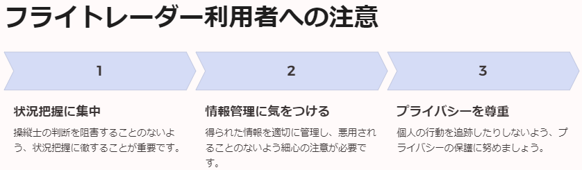 - プライバシー保護の必要性:有名人や重要なビジネスフライトの追跡は慎重に