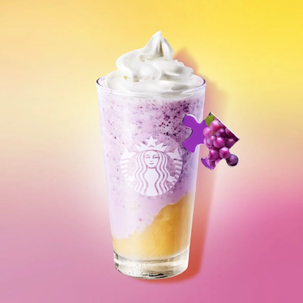 「My フルーツ³ フラペチーノ グレープ & ピーチ」(Tall/750円)/公式サイト引用 皮付きのフローズングレープとミルクをブレンドした「My フルーツ³ フラペチーノ グレープ & ピーチ」は、ピーチ果肉の食感やホイップクリームと一緒にフルーティーさを楽しめる一杯。