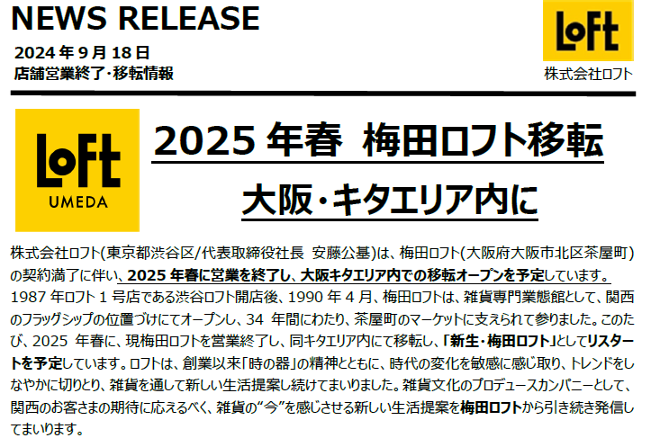- 梅田ロフトは2025年春に34年の歴史を終え、茶屋町の店舗が閉店予定。