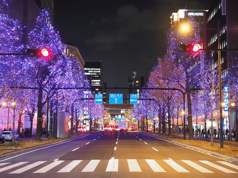 カラフルなイルミネーションでさまざまな色合いを楽しみ、歴史ある御堂筋を美しい光で堪能しましょう。